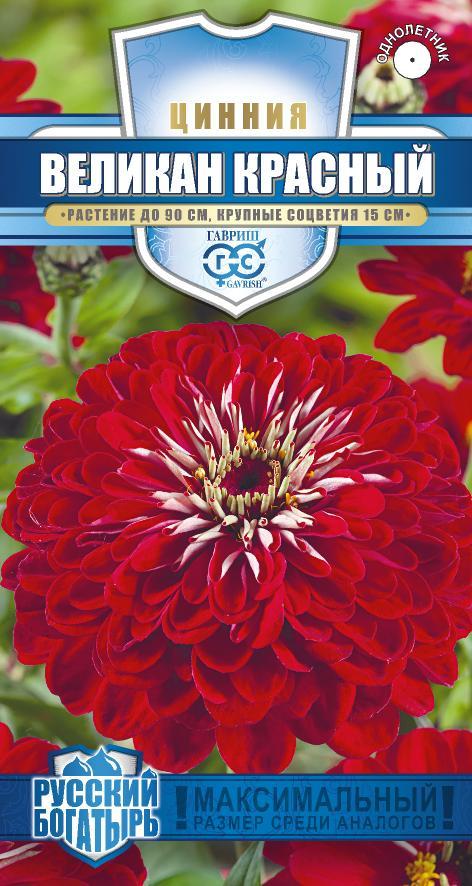 Цинния Великан красный 0,3г серия Русский богатырьСерия высокорослых крупноцветковых цинний для элитного оформления сада. Отличается чрезвычайно обильным и продолжительным цветением, прочными ветвящимися цветоносами, чистыми и стойкими к выгоранию тонами соцветий. Формирует приподнятые, разветвленные кусты высотой до 90 см. Соцветия георгиновидные, крупные, красные, 15 см в диаметре, с высокой устойчивостью к неблагоприятным погодным условиям. Цветет с июня до заморозков. Циннии светолюбивы, засухоустойчивы и теплолюбивы; отзывчивы на полив, без длительного полива снижается интенсивность цветения и уменьшается размер соцветий. Выращивают рассадным способом. Семена высевают в апреле. Всходы появляются через 4-6 дней. В начале июня растения высаживают на расстоянии 20 см.