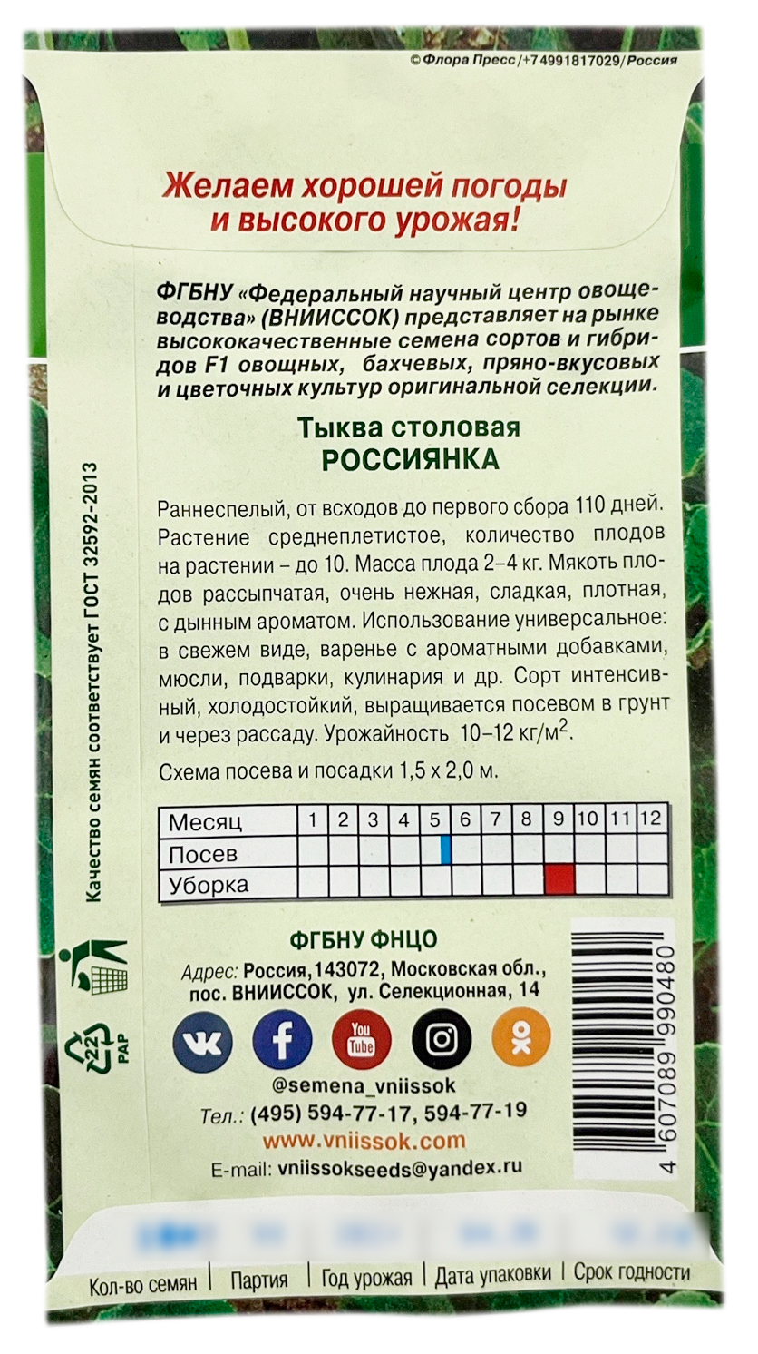 Тыква столовая РОССИЯНКА ВНИИССОКСреднеспелый высокоурожайный сорт (от всходов до первого сбора 110 дней). Плоды ярко-оранжевого цвета, мягкой корой, толстой сухой, сладкой мякотью и с дынным ароматом. Масса плода 2-4 кг. Сорт уверенно занимает самые большие площади при выращивании тыквы практически во всех зонах России. Сорт интенсивный, холодостойкий, выращивается посевом в грунт и через рассаду.