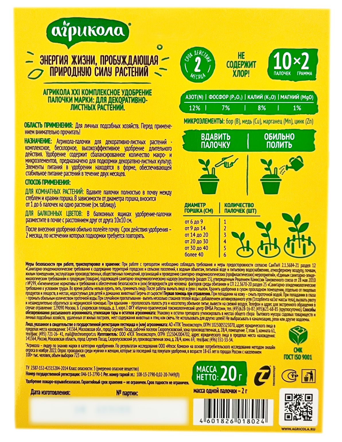 Удобрение Агрикола палочки для декоративнолистных растений 20г- Для комнатных цветов (монстера, колеус, калатея, хлорофитум, драцена и др.);