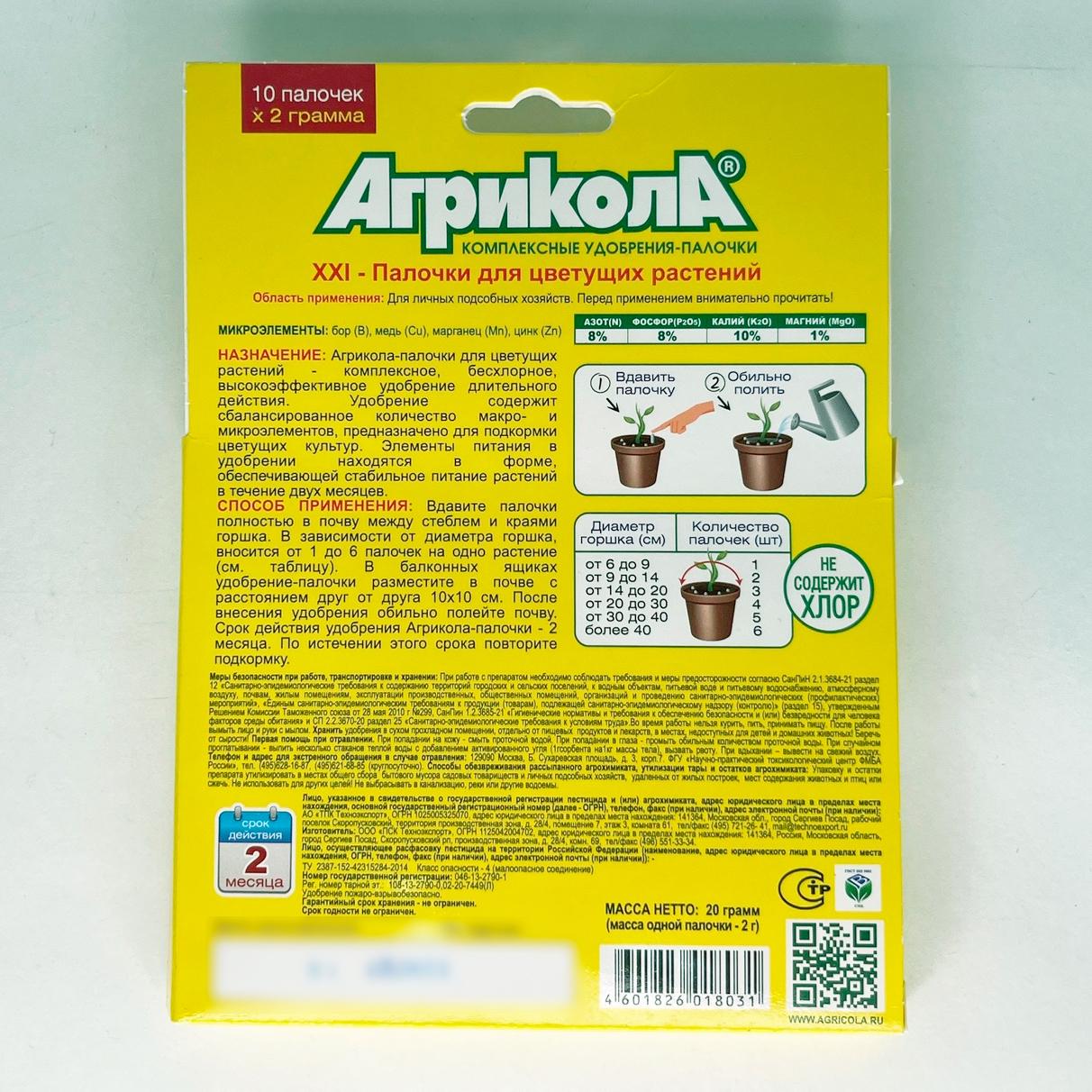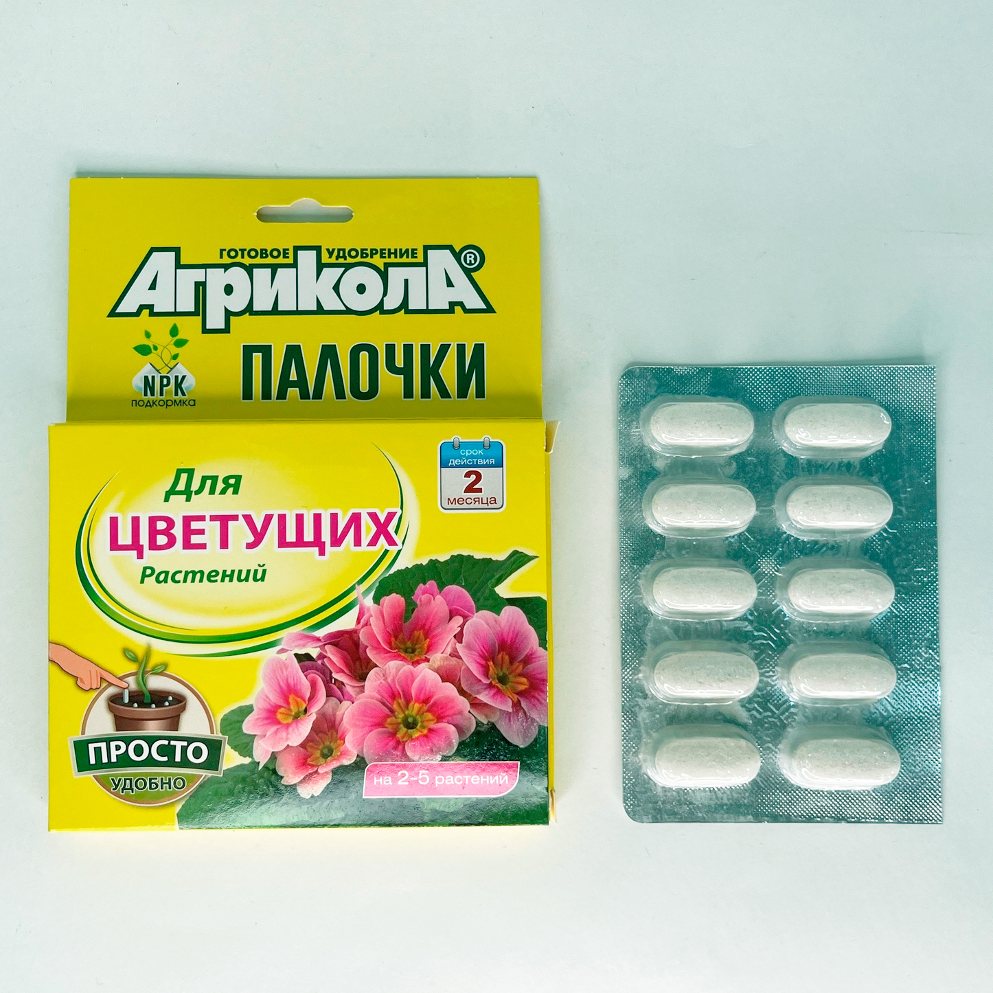 АГРИКОЛА палочки для цветущих растений.Комплексное, бесхлорное, высокоэффективное удобрение длительного действия. Удобрение содержит сбалансированное количество макро- и микроэлементов, предназначено для подкормки цветущих культур. Элементы питания в удобрении находятся в форме, обеспечивающей стабильное питание растений в течении двух недель.