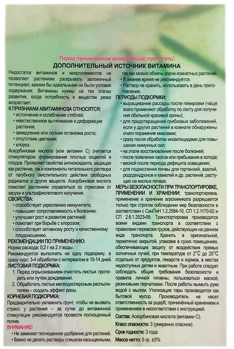Агро Аскорбинка 5грНедостаток витаминов и микроэлементов не позволяет растениям раскрывать заложенный потенциал, какими бы идеальными ни были условия содержания. Витамины нужны на тех этап развития, когда потребность в веществе резко возрастает.