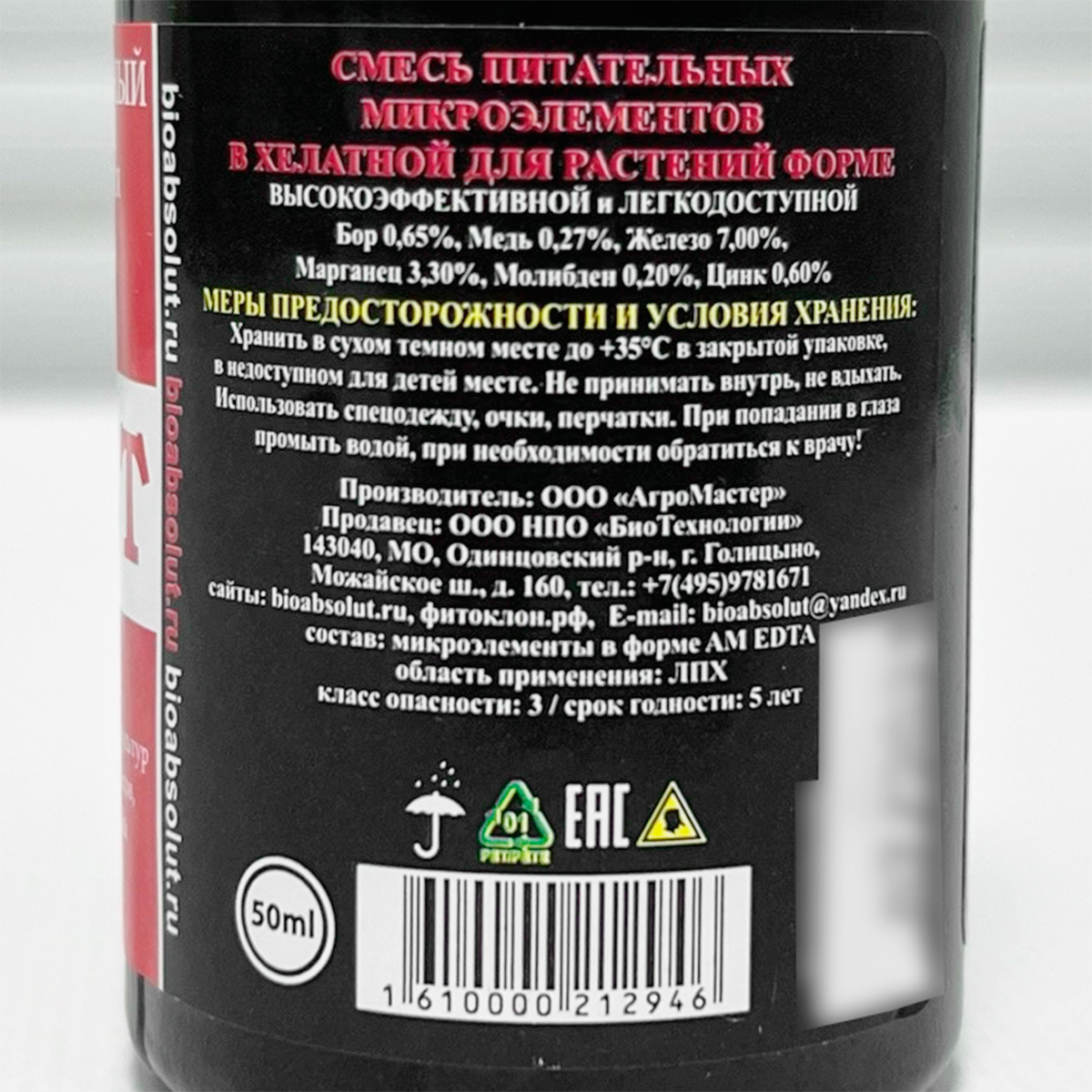 Состав: Бор (В) водорастворимый 0,65%, Медь (Cu) в хелатной форме ЭДТА 0,27%, Железо (Fe) в хелатной форме ДТПА/ЭДТА 7,00%, Марганец (Mn) в хелатной форме ЭДТА 3,30%, Молибден (Mo) водорастворимый 0,20%, Цинк (Zn) в хелатной форме ЭДТА 0,60%.