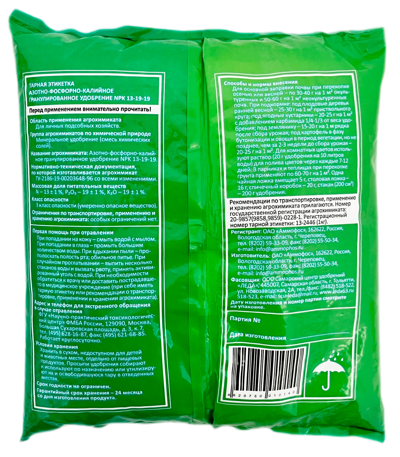 Состав: азотно-фосфорно-калийное гранулированное удобрение NPK 13-19-19.