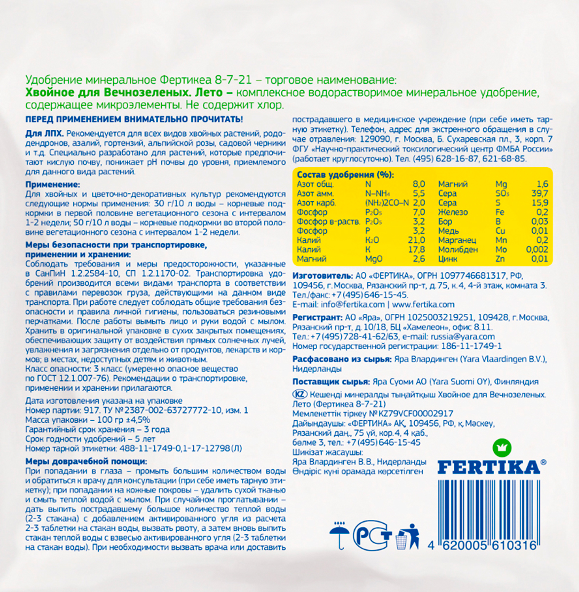 Состав: Азот N 8, Оксид фосфора P2O5 7, Оксид калия K2O 21, Оксид магния MgO 2.6, Сера S 15.9, Бор B 0.03, Медь Cu 0.01, Железо Fe 0.2, Марганец Mn 0.2, Молибден Mo 0.002, Цинк Zn 0.01.