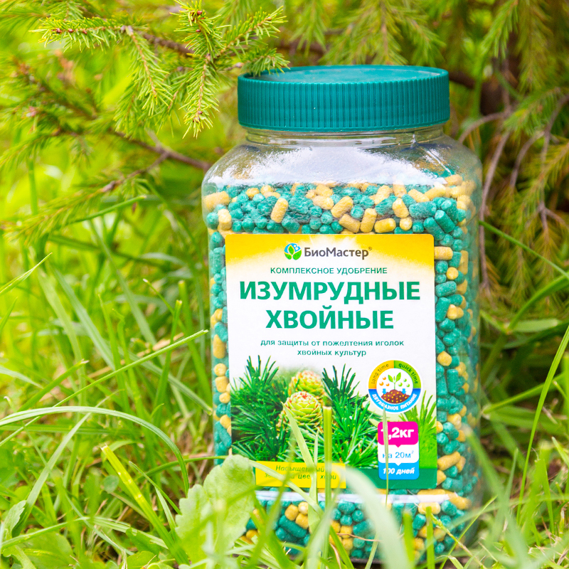 Изумрудные хвойные, 1,2 кг БиоМастерДля пышной, здоровой и яркой зелени хвои гранулы удобрения содержат оптимальное количество магния и серы, помогая избежать коричневения иголок. Удобрение питает хвойники на протяжении 3-х месяцев, укрепляет иммунитет, поддерживает и восстанавливает зеленый цвет хвои.