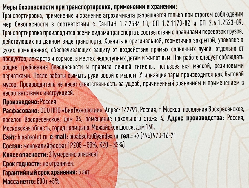 Состав: монокалий фосфат (P205 - 50%, K20 - 33%);
