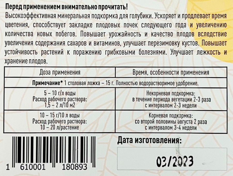 Высокоэффективная минеральная подкормка для голубики. Ускоряет и продлевает время цветения, способствует закладке плодовых почек следующего года и увеличивает количества новых побегов. Повышает урожайность и качество плодов вследствие увеличения содержания сахаров и витаминов, улучшает перезимовку кустов. Повышает устойчивость растений к поражению грибковыми болезнями. Улучшает лежкость и хранение плодов.