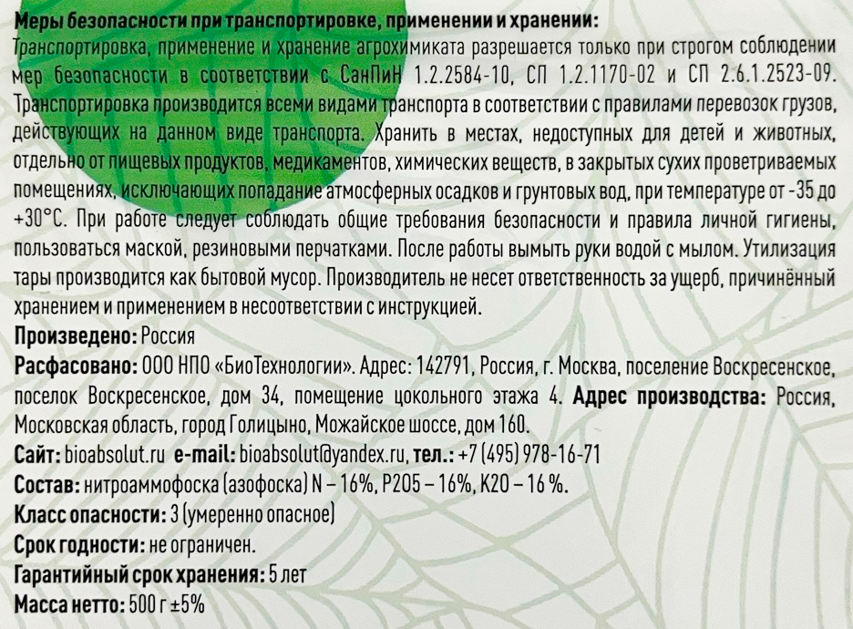 Состав: нитроаммофоска (азофоска) N-16%, P205 - 16%, K-20%;