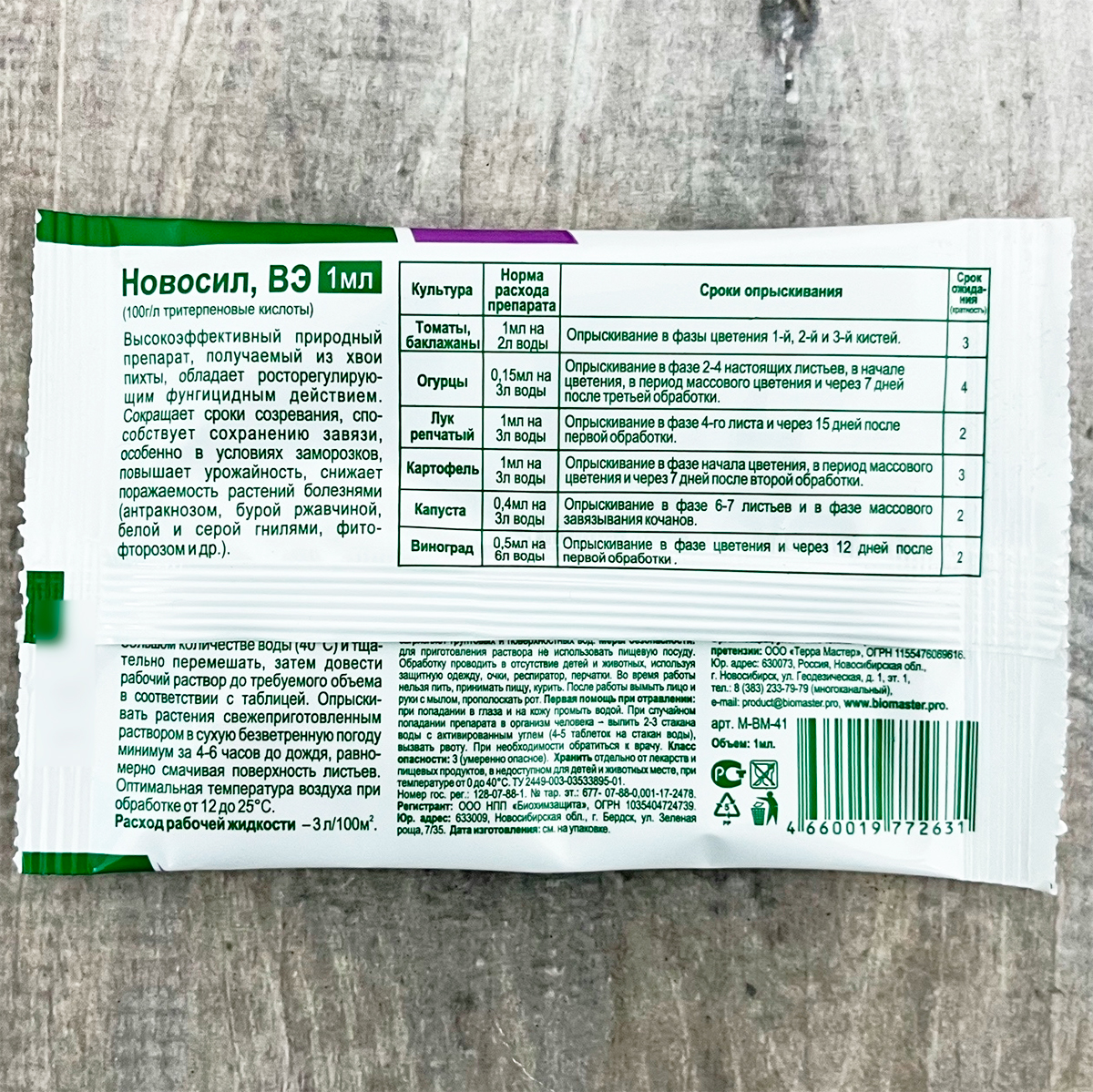 Стимулятор роста «Новосил» – препарат, обладающий росторегулирующим и фунгицидным действием. Изготовлен на основе тритерпеновых кислот, которые получают из хвои пихты сибирской. Препарат применяется для обработки овощных, злаковых, плодово-ягодных культур, а также декоративных садовых растений.Преимущества:
