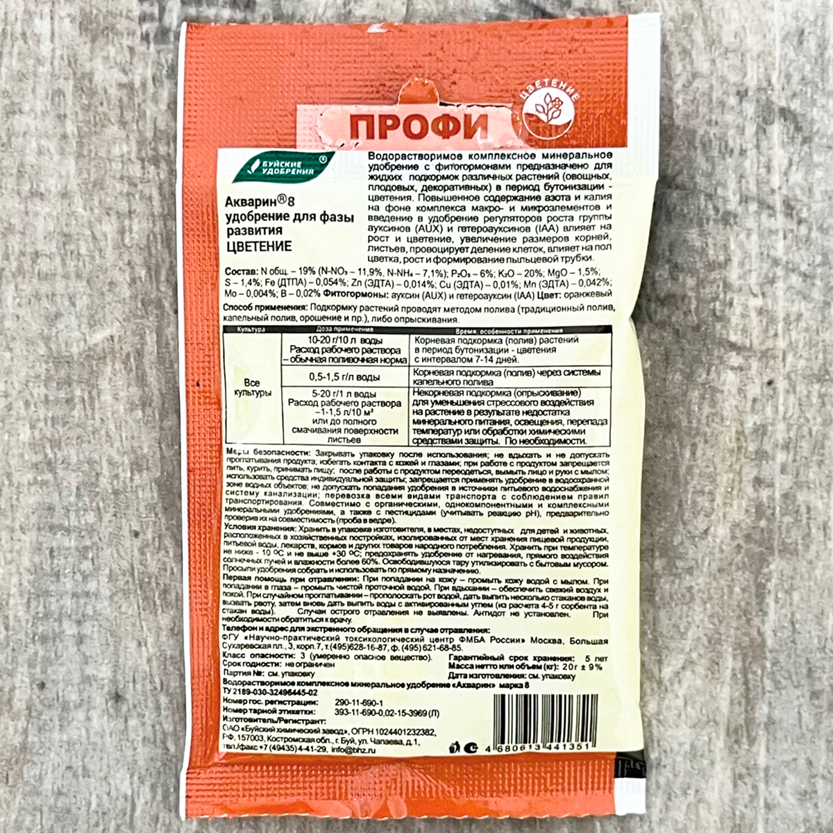 Акварин Профи ЦВЕТЕНИЕ 20гВодорастворимое удобрение, в состав которого входит азот, фосфор, калий, магний, сера и микроэлементы – железо, цинк, марганец, медь в хелатной форме, а бор и молибден – в минеральной. Благодаря кислой реакции (рН) удобрения, оно легко растворяется в холодной воде и более эффективно усваивается корневой системой или листовой поверхностью растений. Рекомендуем хранить в сухом, прохладном месте. Готовые растворы необходимо использовать полностью.