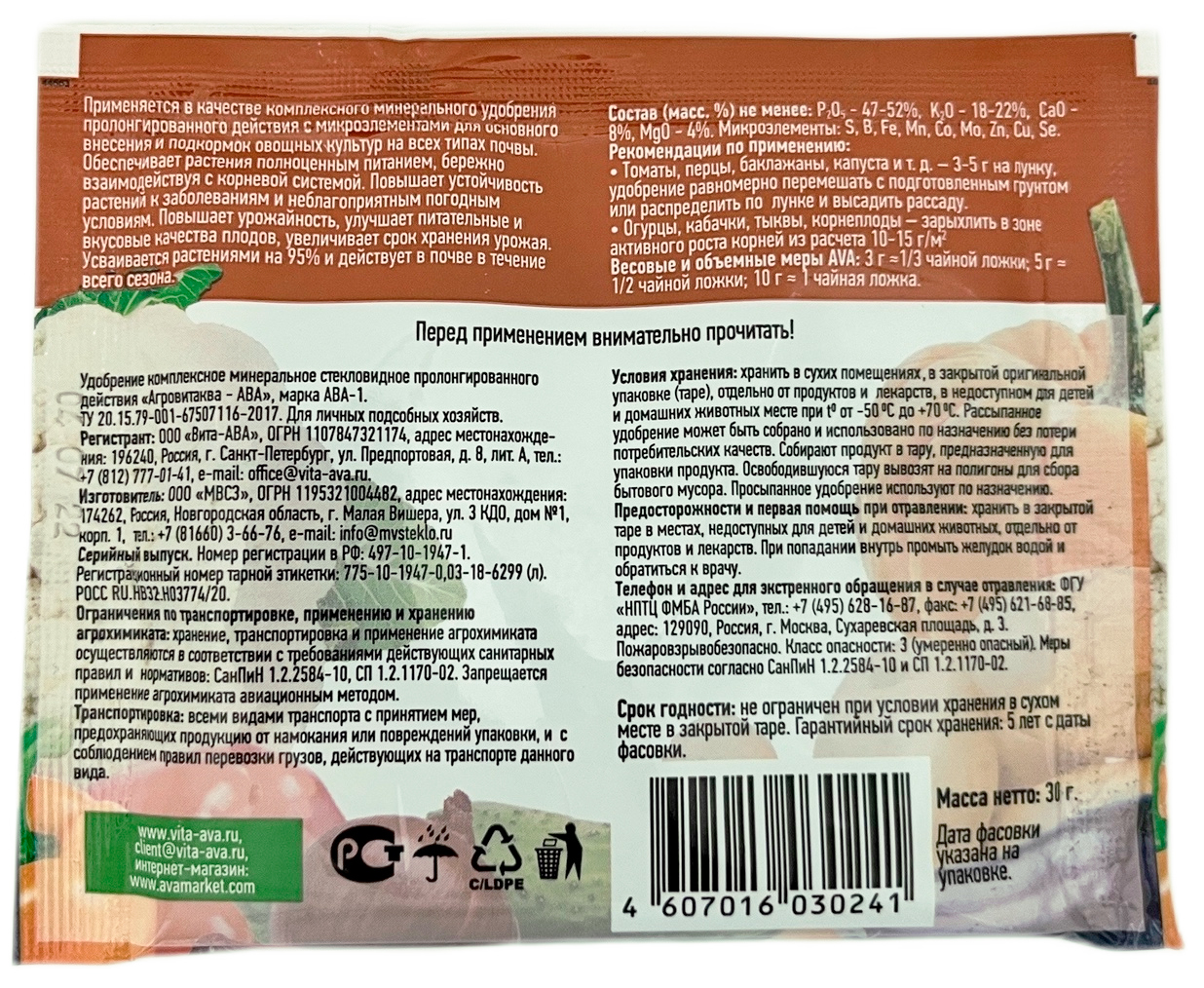 Удобрение AVA для овощей 30гКомплексное минеральное удобрение пролонгированного действия (1 год). Обеспечивает растения полноценным питанием, бережно взаимодействуя с корневой системой. Повышает урожайность, улучшает питательные свойства, увеличивает срок хранения урожая.