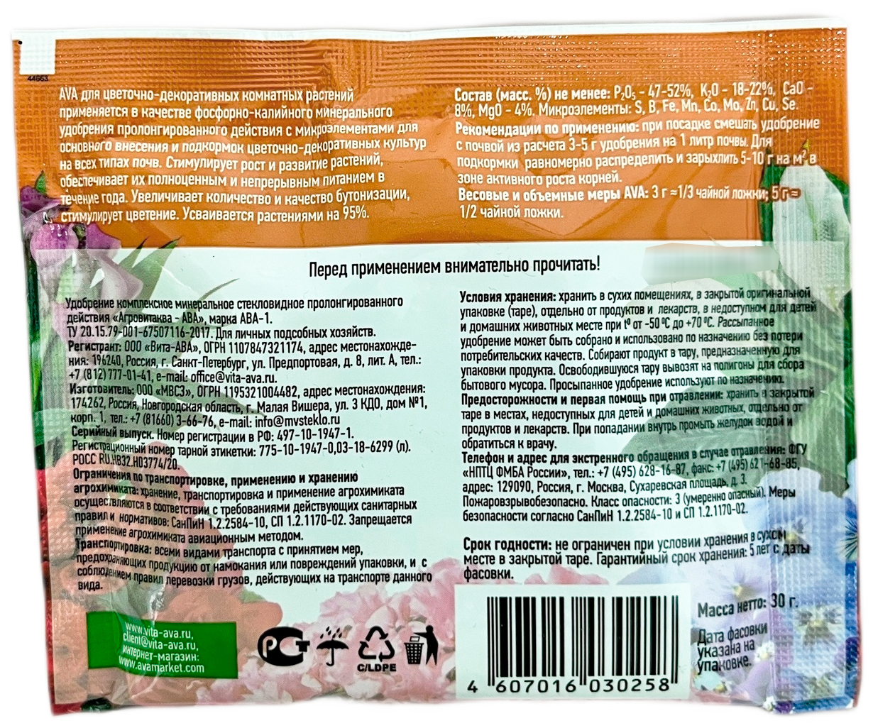 Удобрение AVA для цветочно-декоративных комнатных растений 30гКомплексное минеральное удобрение длительного действия с микроэлементами. Стимулирует рост и развитие растений, увеличивает количество и качество бутонизации, увеличивает продолжительность цветения, повышает интенсивность окраски лепестков, повышает иммунитет к неблагоприятным условиям внешней среды.