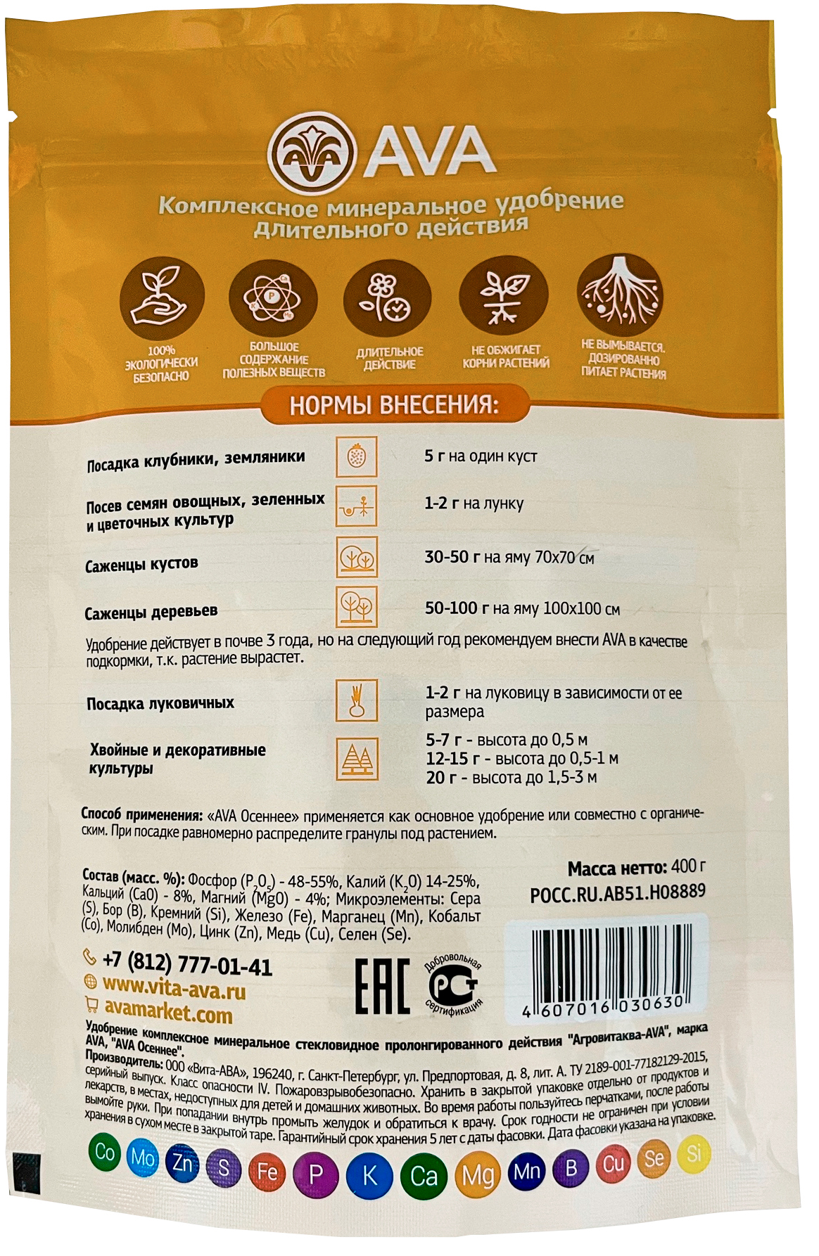 Удобрение AVA Осеннее (400 г)Основное удобрение пролонгированного действия (2-3 года). Фасовка 400 гр.