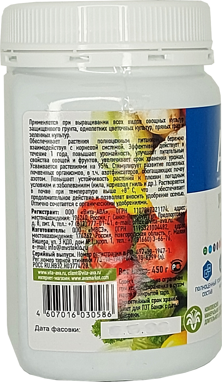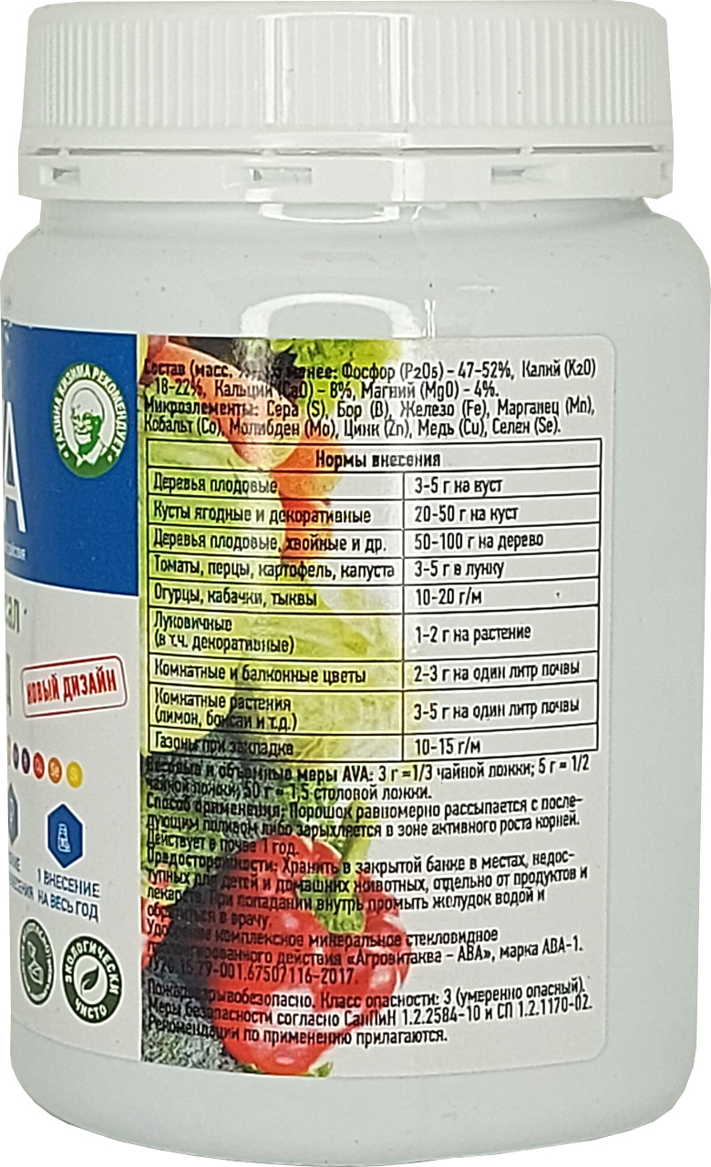 Средние нормы внесения удобрения AVA минимальны — 10-15г на 1 м2, что в 3-5 раз ниже любых других удобрений.