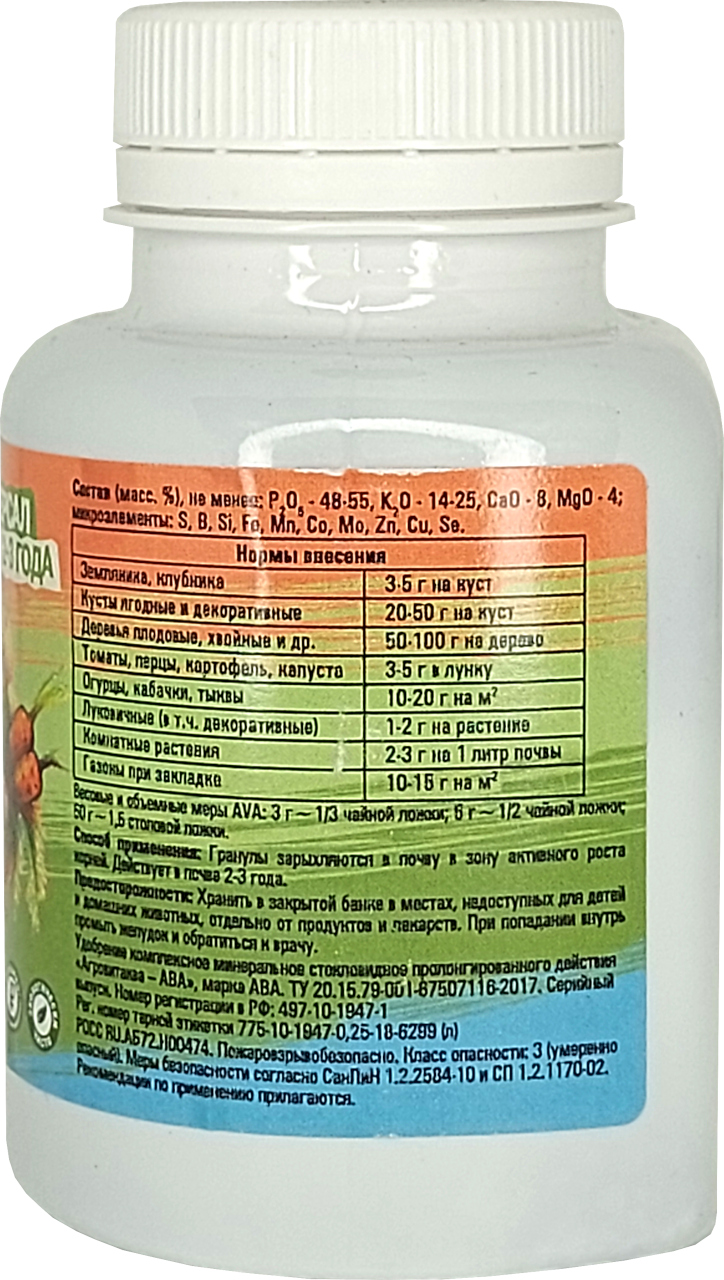 Удобрение АВА AVA Универсал (2-3 года) 250гОсновное удобрение пролонгированного действия (2-3 года) для выращивания многолетних цветов, кустарников, плодовых, хвойных и декоративных деревьев. Фосфор, калий и микроэлементы способствуют раннему и более дружному созреванию плодов, повышают устойчивость саженцев к различным болезням и вредителям.