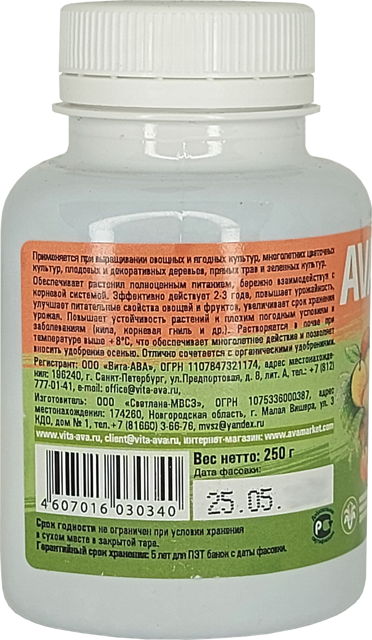 Удобрение AVA — это комплексное бесхлорное, стимулирующее рост почвенных микроорганизмов удобрение, представляющее собой высокотемпературный закаленный расплав солей метафосфорной кислоты. Состав сбалансирован по всем основным элементам питания растений. Удобрение негигроскопично, имеет острую температурную зависимость растворения. Рабочая температура растворения удобрения в почве — выше +8°C. Растворение стеклообразных гранул удобрения происходит постепенно, в течение 2х — 3х лет, в отличие от традиционных удобрений, которые сразу растворяются и вымываются из почвы. Интенсивность растворения гранул AVA зависит от температуры среды, что соответствует изменению потребности растений в питательных элементах при различных температурных условиях. При сезонном снижении температуры и темпов развития биомассы скорость растворения стеклообразных фосфатных гранул также резко замедляется.