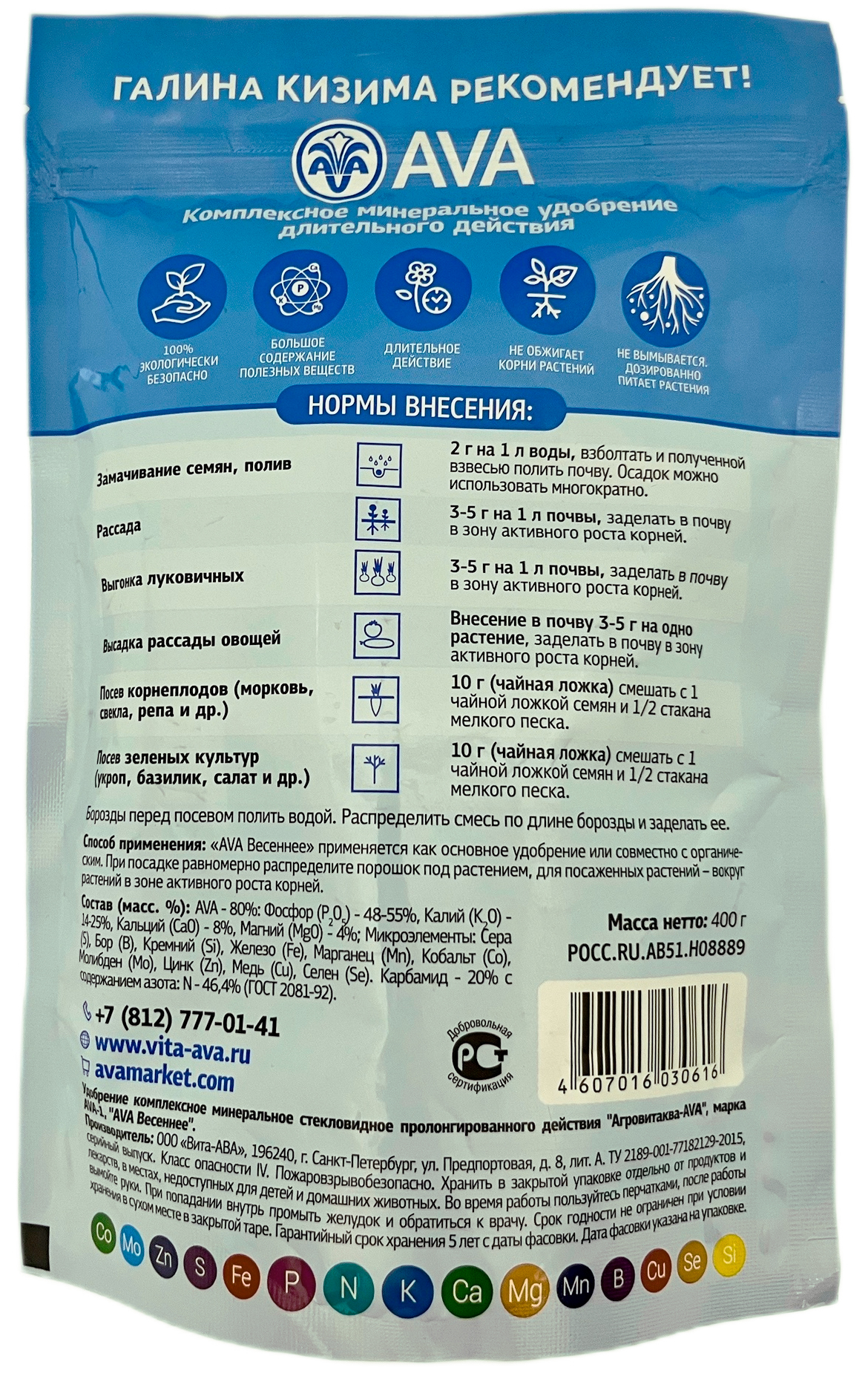 Удобрение AVA Весеннее (400г)Комплексное минеральное удобрение пролонгированного действия (1 год). Применяется весной для выращивания всех видов овощных культур защищенного грунта, однолетних цветочных культур, пряных трав и зеленых культур, а так же для подкормки всех видов многолетних декоративных, плодовых и ягодных культур.