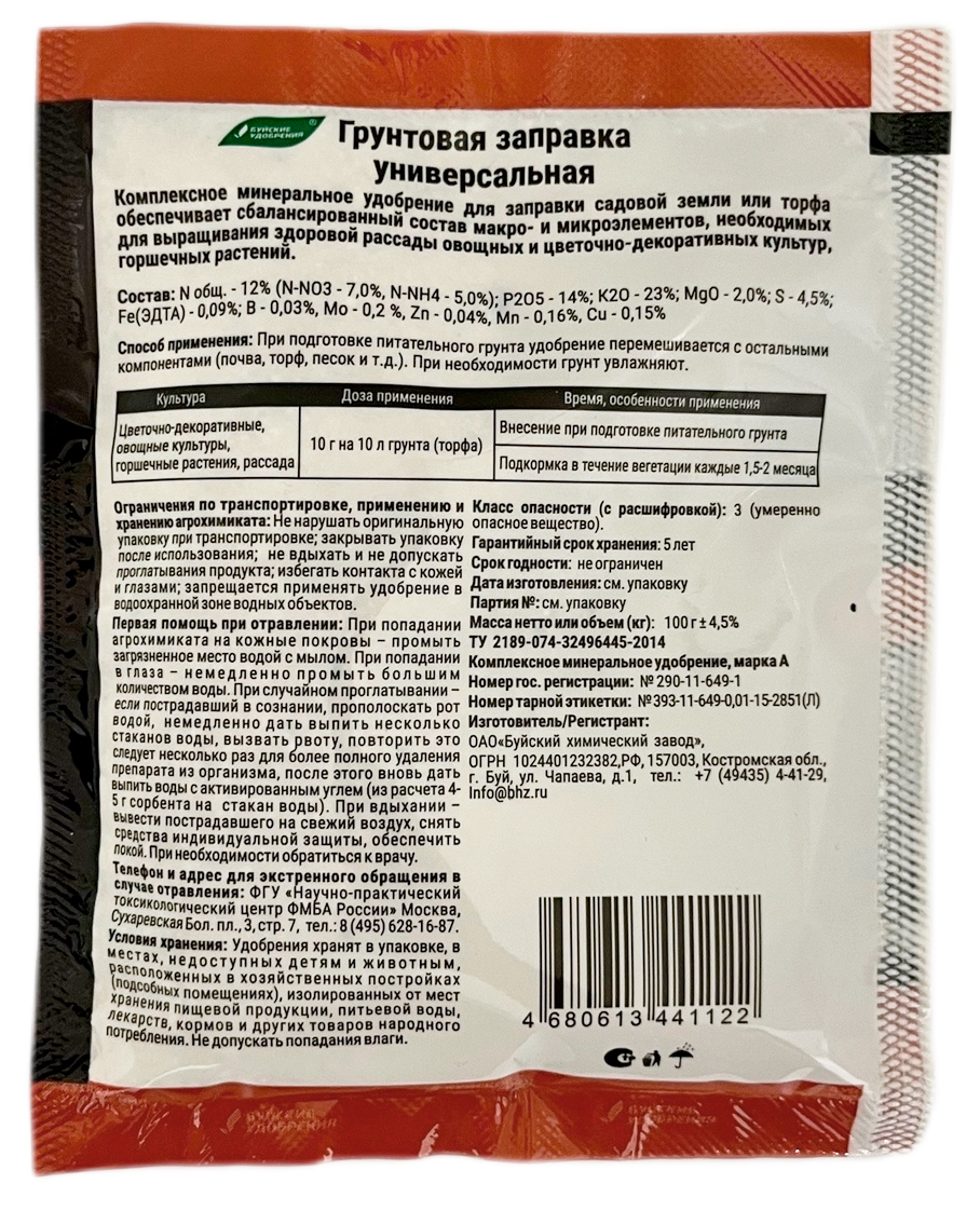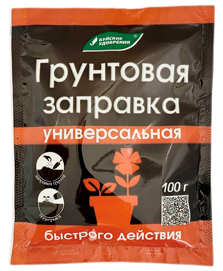 Грунтовая заправка универсальная 100г Буйские УдобренияКомплексное минеральное удобрение для заправки садовой земли или торфа.