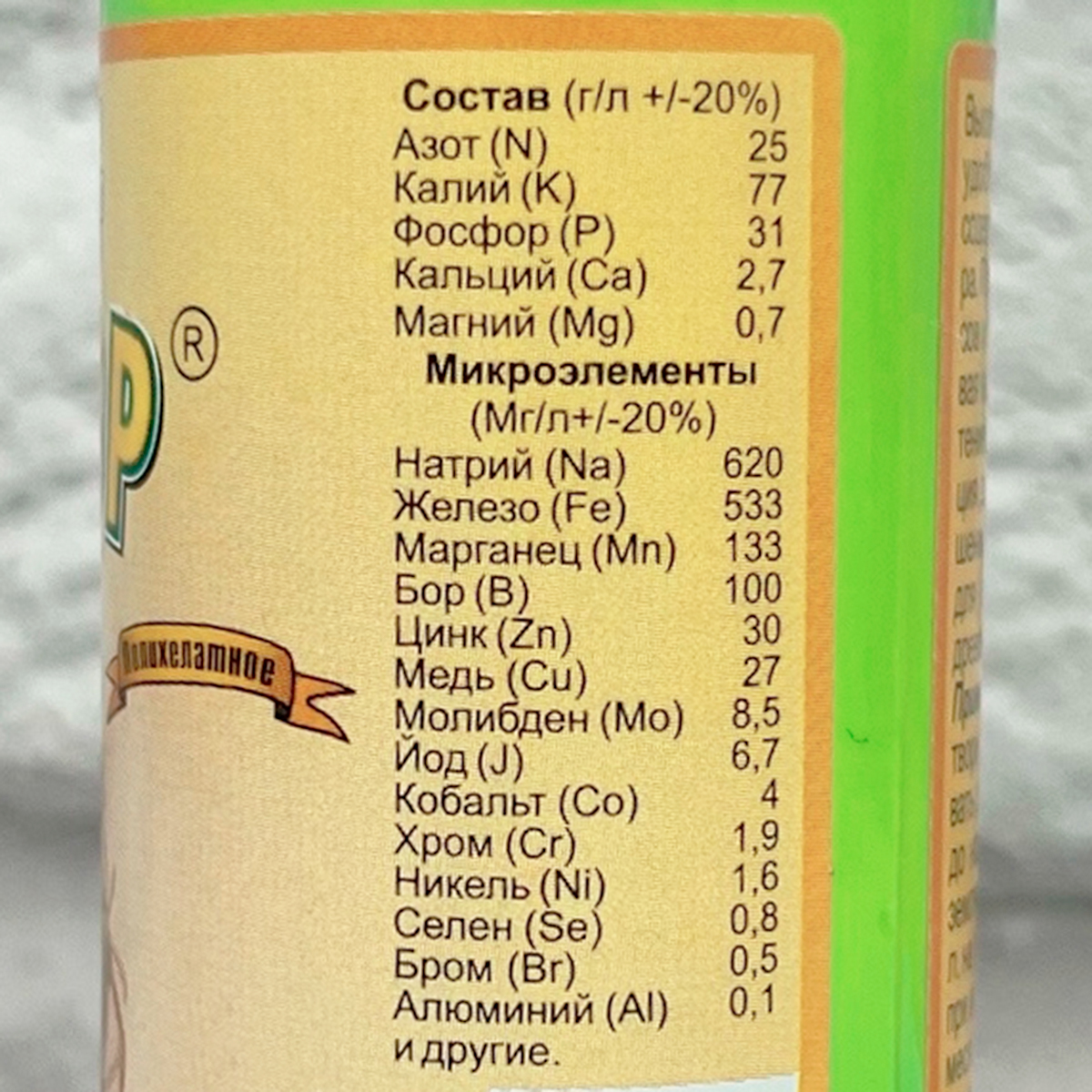 Состав (г/л +/- 20%): Азот (N)-25, Калий (К)-77, Фосфор (Р)-31, Магний (Мg)-0.7, Кальций (Ca)-2.7.