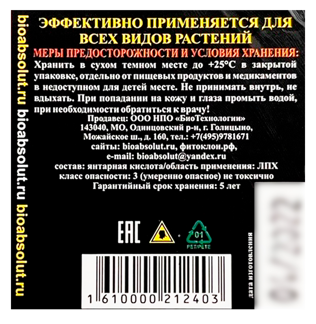 Янтарная кислота 50мл БиоабсолютЯнтарная кислота это универсальный стимулятор роста и развития цветов и декоративных растений. Янтарная кислота используется для стимуляции всех вегетативных процессов у растений. Янтарной кислотой обрабатывают как взрослые растения, так и посадочный материал.