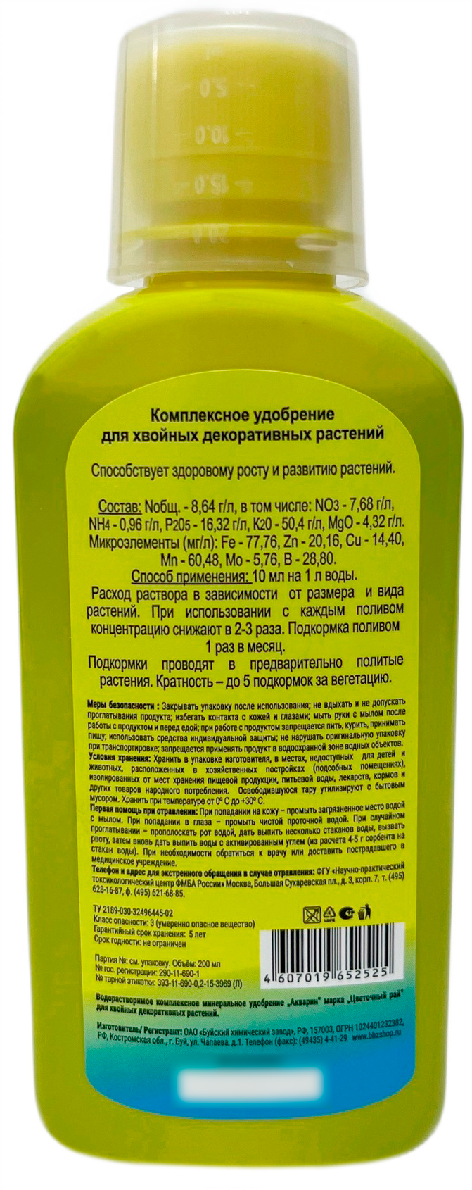 Жидкое комплексное удобрение "Цветочный рай" для декоративных хвойных растенийСбалансированный комплекс высокоэффективных, легкодоступных для растений микроэлементов – Fe, Mn, Zn, Cu, в виде сложных органических солей – хелатов, а также B, Mo. За счет этих элементов способствует здоровому росту и развитию растений. Стимулирует развитие побегов, сочной зеленой листвы, обильного и длительного цветения. Устраняет видимые проявления дефицита элементов питания, предотвращает развитие болезней, вызванных недостатком тех или иных микроэлементов.