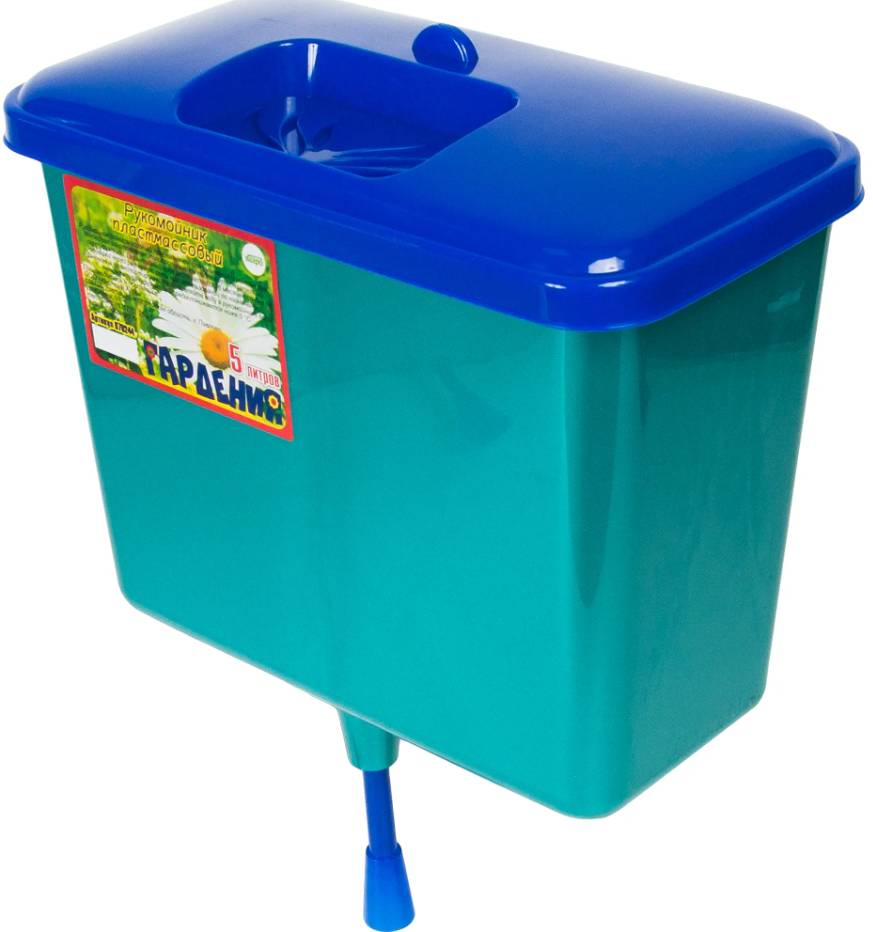 Умывальник 5л ГарденияРукомойник дачный «Гардения» — подвесной сосуд для умывания, мойки посуды, фруктов, овощей, ягод. Используется в местах, не оборудованных водопроводом. Может устанавливаться и внутри помещений, и на улице. Модель изготовлена из полипропилена с добавлением голубого красителя, имеет прямоугольную форму. Конструкция снабжена крышкой и подвижным стержнем для подачи воды. При температуре ниже 0˚ С воду из емкости следует сливать. Размеры изделия — 274 × 230 × 140 мм, объем — 5 л. Товар произведен в России. Гарантия — 2 года.