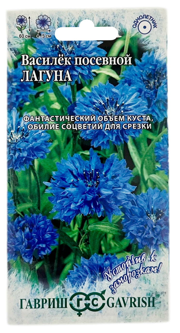 Василёк синий ЛАГУНА ГАВРИШОднолетнее растение из семейства Астровые высотой 60 см. Сорт срезочный, обильно и продолжительно цветущий с июня до заморозков. Растение стройное, ветвистое, с многочисленными цветоносами. Соцветия махровые, ярко-синие, 4-5 см в диаметре. Светолюбив, холодостоек, относительно засухоустойчив, к почве нетребователен, но не любит переувлажнения. Выращивают прямым посевом в открытый грунт. Семена высевают в апреле – начале мая или под зиму гнездами по 3-4 шт. Расстояние между растениями 35-40 см. Для большей кустистости растения прищипывают. Используется для посадки на клумбах, в группах, миксбордерах, и рабатках, а также для получения срезки.