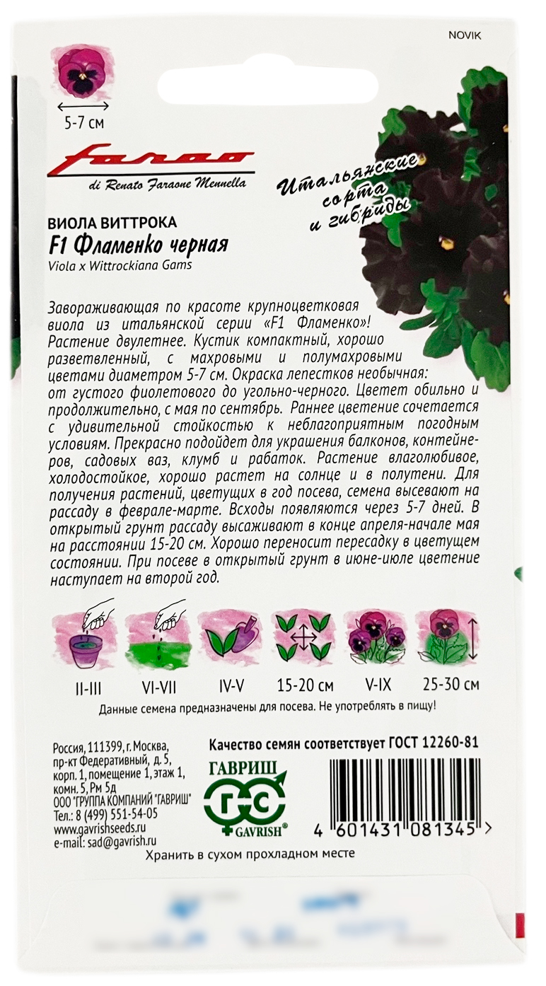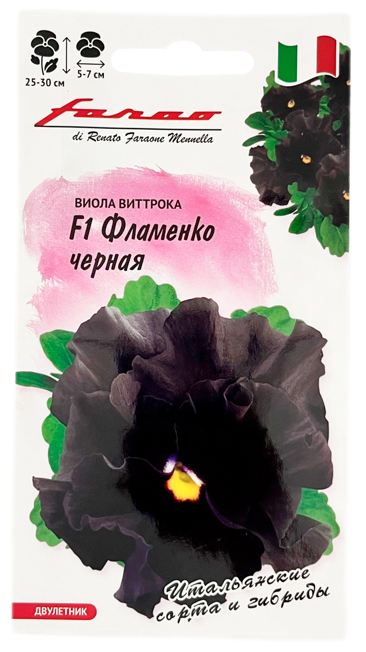 Виола Фламенко черная F1 Виттрока ГАВРИШЗавораживающая по красоте крупноцветковая виола из итальянской серии «F1 Фламенко»! Растение двулетнее. Кустик компактный, хорошо разветвленный, с махровыми и полумахровыми цветами диаметром 5-7 см. Окраска лепестков необычная: от густого фиолетового до угольно-черного. Цветет обильно и продолжительно с мая по сентябрь. Раннее цветение сочетается с удивительной стойкостью к неблагоприятным погодным условиям. Прекрасно подойдет для украшения балконов, контейнеров, садовых ваз, клумб и рабаток. Растение влаголюбивое, холодостойкое, хорошо растет на солнце и в полутени. Для получения растений, цветущих в год посева, семена высевают на рассаду в феврале-марте. Всходы появляются через 5-7 дней. В открытый грунт рассаду высаживают в конце апреля-начале мая на расстоянии 15-20 см. Хорошо переносят пересадку в цветущем состоянии. При посеве в открытый грунт в июне-июле, цветение наступает во второй год.