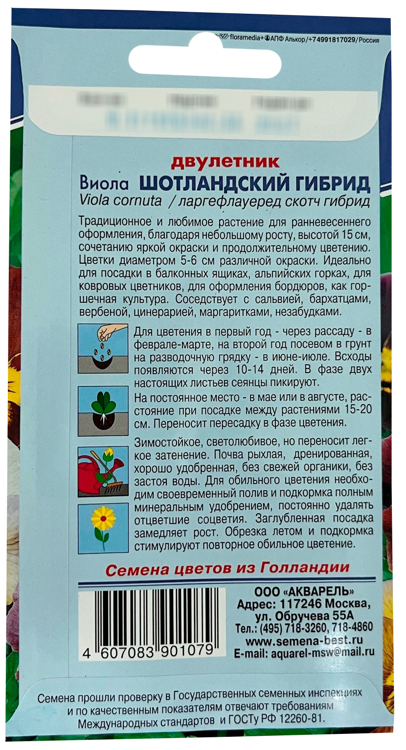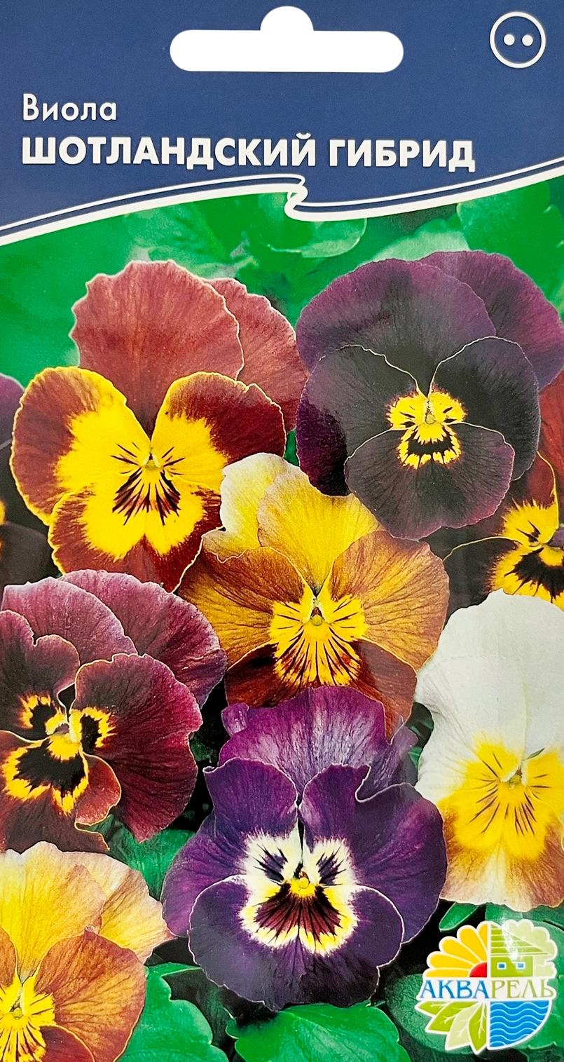 Виола Шотландский гибрид АКВАРЕЛЬ (Viola cornuta)Многолетнее растение, чаще выращивается как двулетнее. Высота 15-20 см. Диаметр соцветий 5-6 см. Идеально для посадки в балконных ящиках, газонах, альпийских горках, для ковровых цветников, рабаток, рокариев.