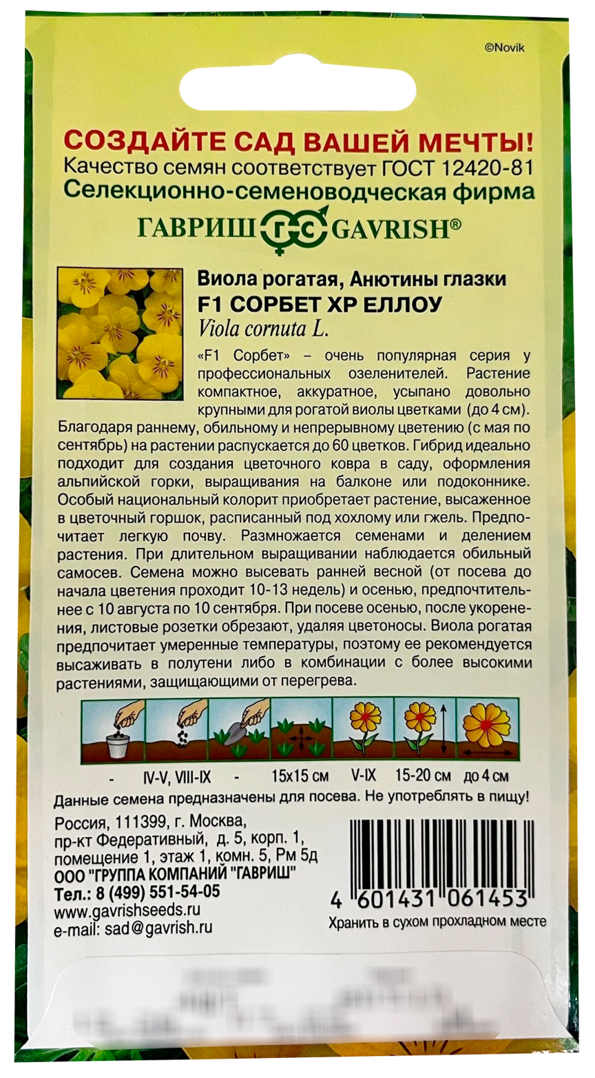 Виола рогатая Анютины глазки Сорбет XP Еллоу F1 ГАВРИШ«F1 Сорбет» очень популярная серия среди профессиональных озеленителей. Формирует компактный аккуратный кустик, усыпанный довольно крупными для рогатой виолы цветками (3,0-4,5 см). Благодаря раннему, обильному и непрерывному цветению, с мая по сентябрь на кустике распускается до 60 цветков. Гибрид идеально подходит для создания цветочного ковра в саду, оформления альпийской горки, выращивания на балконе или подоконнике. Особый национальный колорит приобретает растение, высаженное в цветочный горшок, расписанный под хохлому или гжель. Предпочитает легкую почву. Размножается семенами и делением куста. При длительном выращивании наблюдается обильный самосев. Семена можно высевать ранней весной (от посева до начала цветения проходит 10-13 недель) и осенью, предпочтительнее с 10 августа по 10 сентября. При посеве осенью, после укоренения листовые розетки обрезают, удаляя цветоносы. Виола рогатая предпочитает умеренные температуры, поэтому ее рекомендуется высаживать в полутени, либо в комбинации с более высокими растениями, защищающими от перегрева. Отлично смотрится на полутенистой альпийской горке.