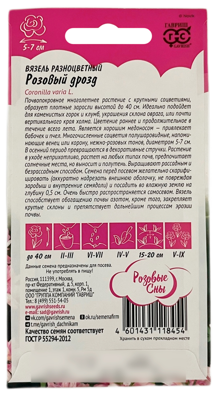 Вязель разноцветный РОЗОВЫЙ ДРОЗД ГАВРИШПочвопокровное многолетнее растение с крупными соцветиями, образует плотные заросли высотой до 40 см. Идеально подойдет для каменистых горок и клумб, украшения склона оврага, или почти вертикального края холма. Цветение ранее и продолжительное в течении всего лета. Является хорошим медоносом — привлекает бабочек и пчел. Многочисленные соцветия полушаровидные, напоминающие венец или корону, нежно-розовых тонов, диаметром 5-7 см. В осенний период превращаются в декоративные стручки. Растение в уходе неприхотливо, растет на любых типах почв, предпочитает солнечные места, но выносит и полутень. Выращивают рассадным и безрассадным способом. Семена перед посевом желательно скарифицировать (аккуратно надрезать внешнюю оболочку, не повреждая зародыш и внутренние семядоли) и посадить во влажную землю на глубину 0,5 см. Очень быстро распространяется самосевом. Вязель способствует обогащению почвы азотом, кроме того, закрепляет крутые склоны и препятствует дальнейшим процессам эрозии почвы.