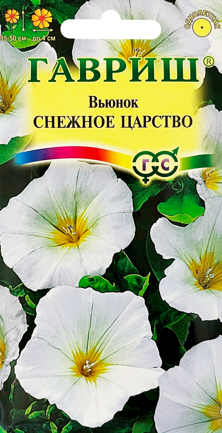 Вьюнок Снежное Царство ГАВРИШОднолетнее травянистое, густоветвистое растение семейства Вьюнковые, 35-50 см высотой, со стелющимися и приподнимающимися побегами. На растении каждый день расцветают новые цветки. Цветки ширококолокольчатые, до 4 см в диаметре, снежно-белые. Цветет обильно с июля по сентябрь. Холодостойкое, светолюбивое. Высевают в марте на рассаду или в середине апреля – начале мая в открытый грунт. Всходы появляются через 2 недели. Посадку на постоянное место производят в мае, выдерживая расстояние между растениями 20-25 см. Используют в рабатках, на клумбах, каменистых горках, для озеленения балконов и ваз. Для получения пышноцветущих растений их несколько раз за сезон прищипывают.
