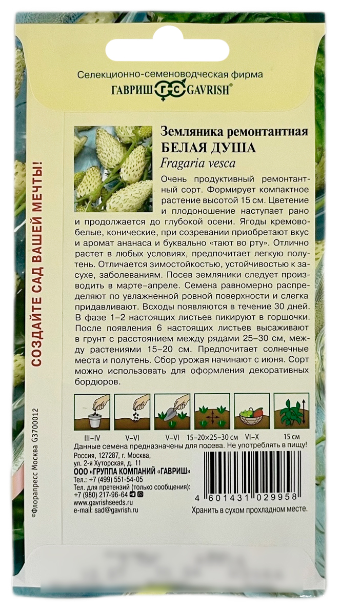 Земляника Белая душа ГАВРИШОчень продуктивный ремонтантный сорт. Формирует компактный кустик высотой 15 см. Цветение и плодоношение наступает рано и продолжается до глубокой осени. Ягоды кремово-белые, конические, при созревании приобретают вкус и аромат ананаса и буквально «тают во рту». Отлично растет в любых условиях, предпочитает легкую полутень. Отличается зимостойкостью, устойчивостью к засухе, заболеваниям. Посев земляники следует производить в марте-апреле. Семена смешивают с песком и равномерно распределяют по увлажненной ровной поверхности. Всходы появляются в течение 30 дней. В фазе 1-2 настоящих листьев пикируют в горшочки. После появления 6 настоящих листьев высаживают в грунт с расстоянием между рядами 25-30 см, между растениями 15-20 см. Предпочитает солнечные места и полутень. Сбор урожая начинают с июня. Сорт можно использовать для оформления декоративных бордюров.