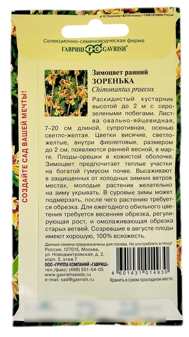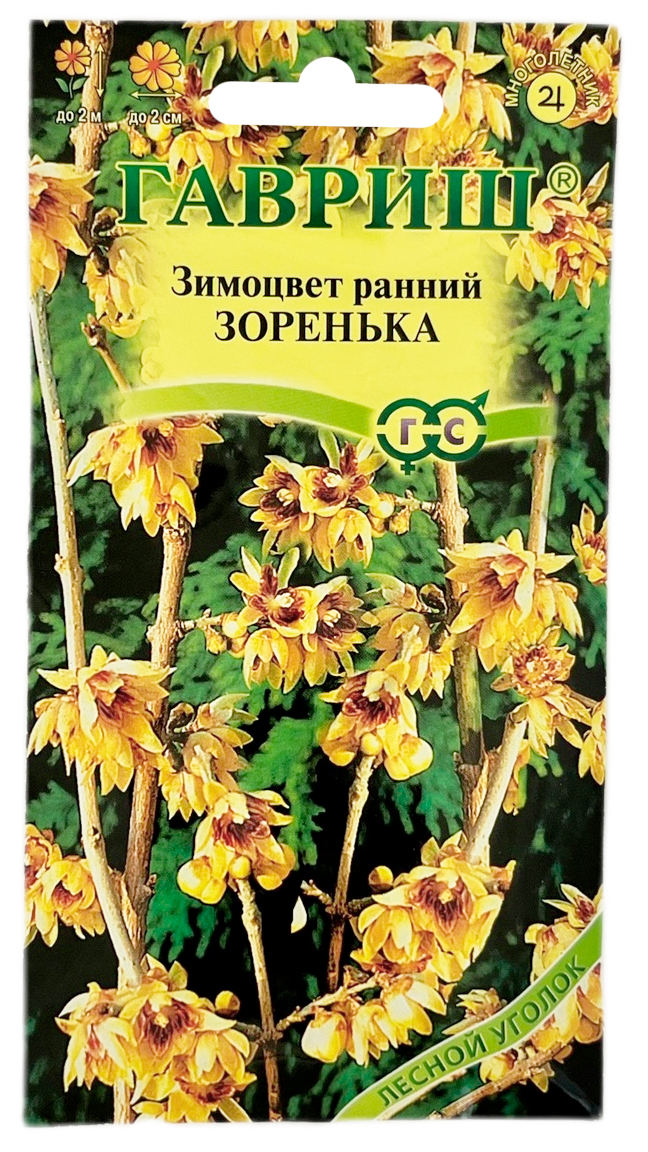 Зимоцвет ранний ЗОРЕНЬКА ГАВРИШРаскидистый кустарник высотой до 2 мс серо-зелеными побегами. Листва овально-яйцевидная, 7-20 см длиной, супротивная, осенью светло-желтая. Цветки висячие, светло-желтые, внутри фиолетовые, размером до 2 см, появляются ранней весной, в марте. Плоды-орешки в кожистой оболочке. Предпочитает теплые участки на богатой гумусом почве. В суровые зимы может подмерзать, после чего растению требуется обрезка. Высаживают в защищенных от холодных зимних ветров местах, с укрытием на зиму.